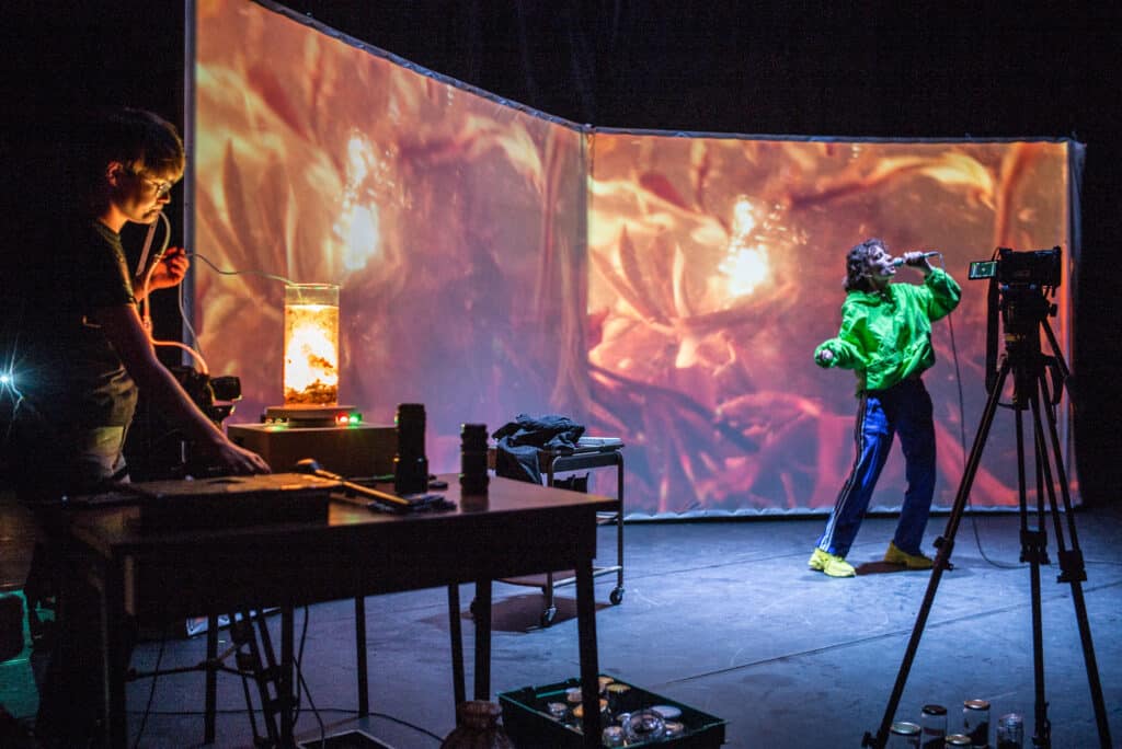 De prime abord, le geste d’Elsa Thomas fait corps avec le régime de sensibilité dont elle a hérité : celui d’un père formé pendant quatorze ans à la cérémonie du thé, qui a tiré de cette expérience une éthique déterminante et surtout une corporéité, un langage – un “ressenti insaisissable“ qu’aucune altérité ne semble pouvoir perturber. Et pourtant la forme théâtrale, dans son calme prolongé mais aussi dans ses impulsions momentanées, ne doit plus grand chose à son silence imperturbable. Elsa Thomas ne cherche pas, comme on s’y attendrait, des équivalences scéniques aux étapes successives de la cérémonie, mais place d’entrée le spectacle sous l’égide de sa propre profession et procession : l’écriture de scénario. Un régime dramaturgique qui charrie, comme elle le nomme elle-même, une conscience de l’éphémère. Contrairement aux feuilles de thé, les pages scénaristiques s’envolent dès que le film prend vie – tout comme les différentes parties de ce spectacle qui se substituent parfois l’une à l’autre, et élaborent un récit familial et biographique volontiers discontinu et contradictoire. Des bocaux par exemple, renfermant les souvenirs marquants d’Elsa, sont d’abord montrés dans toute leur charge mémorielle, puis ouverts et désacralisés au terme de la représentation. Au spectacle cérémonieux qu’elle aurait pu s’imposer, Elsa Thomas préfère en somme une expérience latente à la Claude Sautet. Un théâtre de chambre secrète qui, comme ses films, « garde le calme face à la dissonance », non pas pour noyer mais pour induire l’affleurement discret et d’autant plus violent du réel.